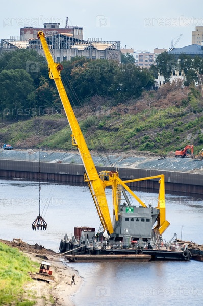 Плавучий кран добывает песок. Тюмень. Россия