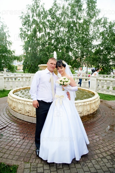 Молодожены молодая пара после церемонии в городском парке