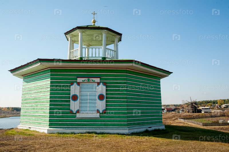 Нижняя Синячиха, Россия - 24 сентября 2013 г.: Ротонда-часовня Александра Невского. 19 век. Перевезен из села Останино Алапаевского района. Музей деревянного зодчества