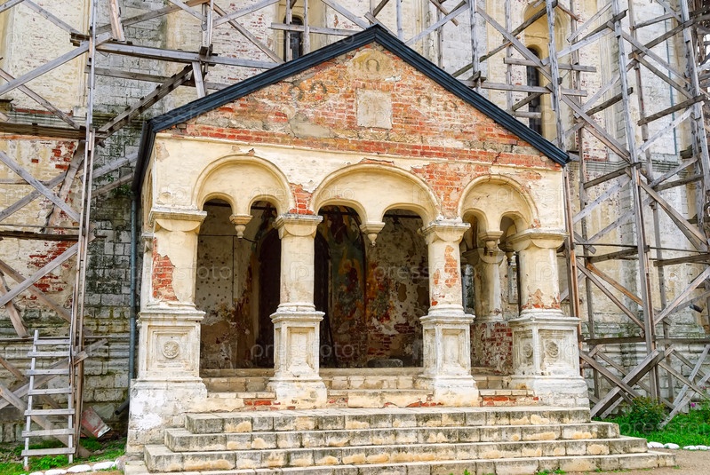 Ростов, Россия - 31 августа 2009 г.: Реставрация Успенского собора в Ростовском Кремле. Вход с южной стороны