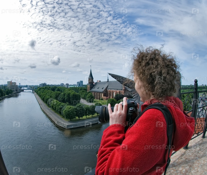 Женщина фотографирует исторический центр и Соборную церковь на острове Канта в Калининграде