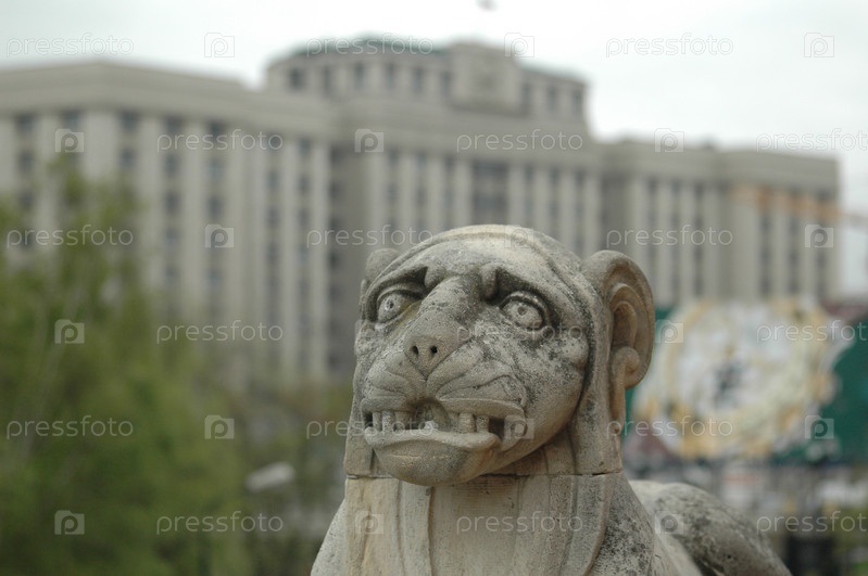 Москва, Россия - 12 мая 2006 г.: Фигура льва на памятнике Победы над Наполеоном на фоне Государственной Думы Российской Федерации