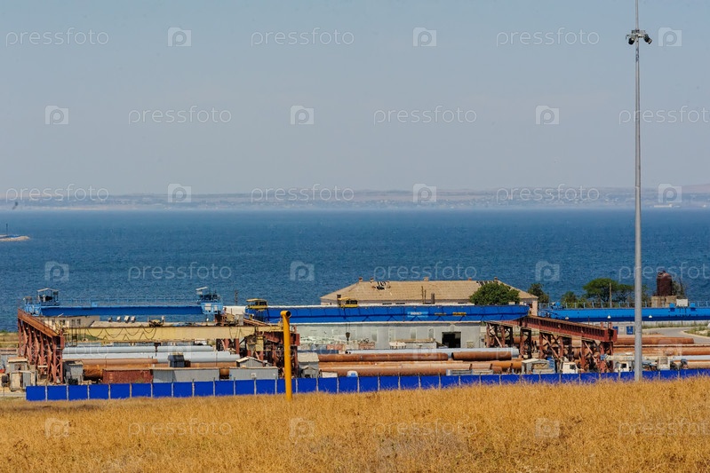 Тамань, Россия - 12 июля 2017 г.: Строительство моста через Керченский пролив, вид на побережье и соединение косы Тузла с Таманского полуострова