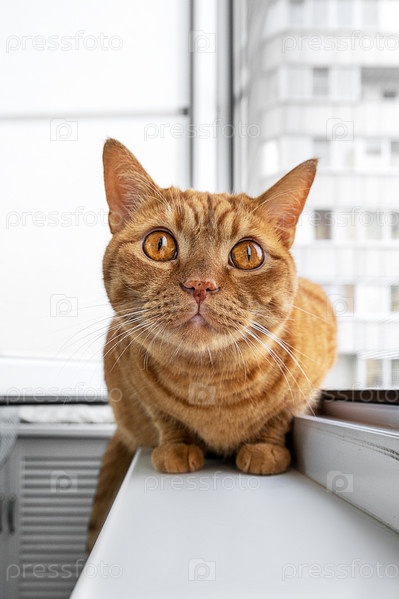 Большой взрослый милый рыжий кот сидит на подоконнике
