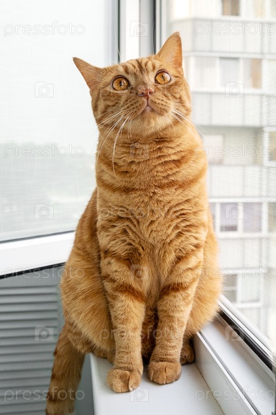 Большой взрослый милый рыжий кот сидит на подоконнике