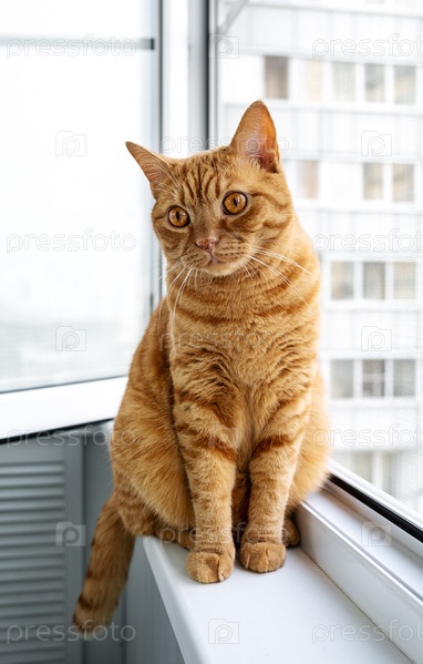 Большой взрослый милый рыжий кот сидит на подоконнике