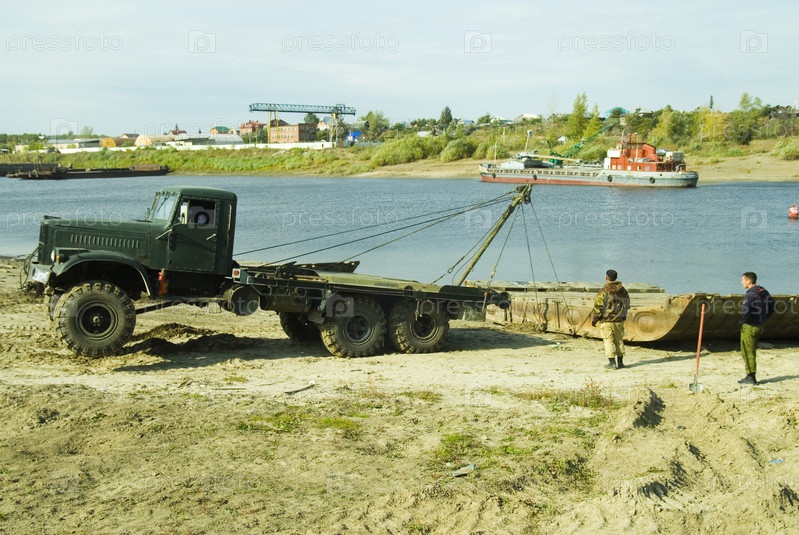 Тюмень, Россия - 19 сентября 2009 г.: Грузовик тянет модуль понтонного моста с реки Тура