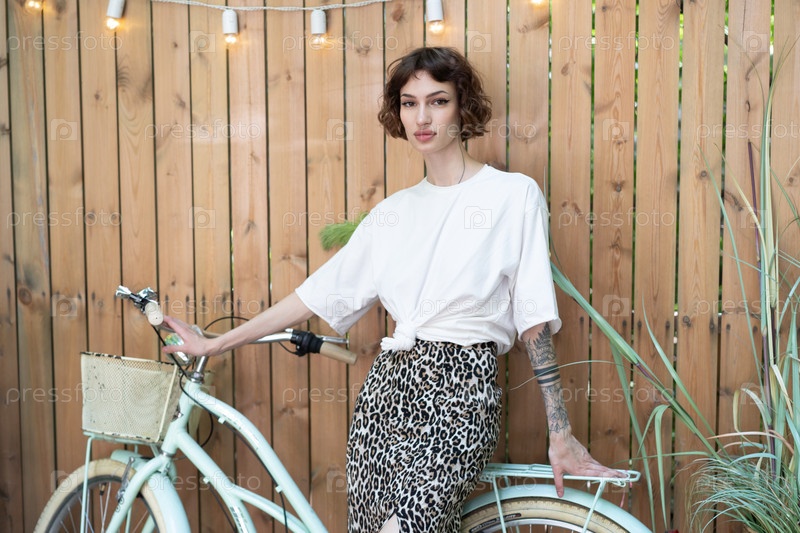 Молодая красивая женщина позирует на улице рядом с велосипедом