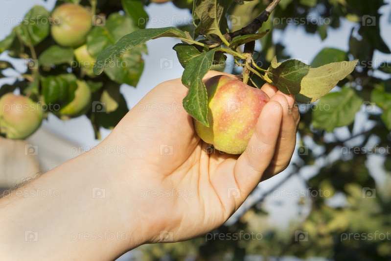 Рука держит яблоко, висящее на ветке