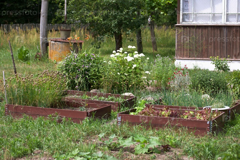 Грядки с зеленью и овощами. Хозяйство в деревне