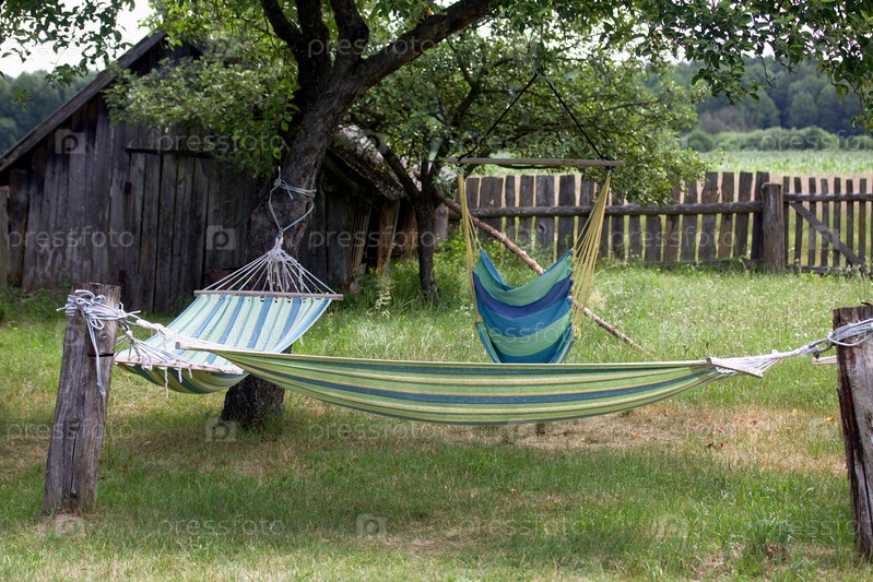 Для отдыха вешают гамаки. Между столбами и деревьями. Старый деревянный забор, сельский отдых