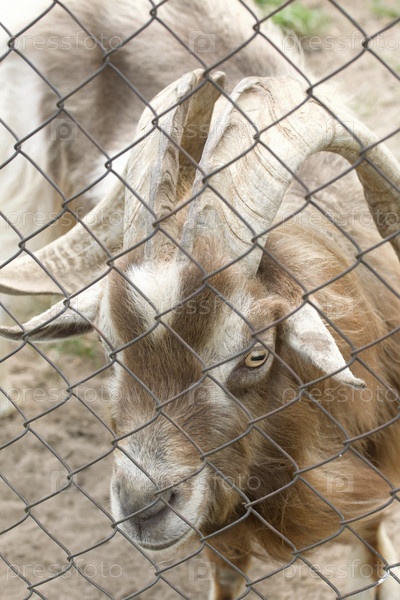 Горный козел с закрученными рогами. В вольере зоопарка. Крупный план