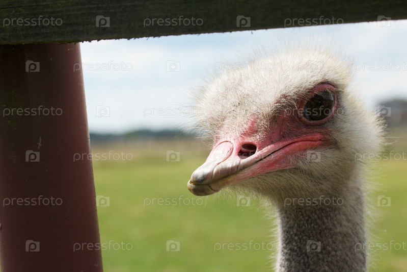 Голова страуса среди досок деревянного забора. Крупный план