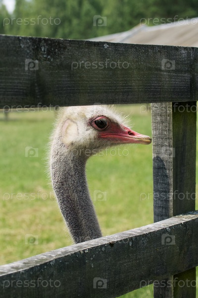 Голова страуса среди досок деревянного забора. Крупный план