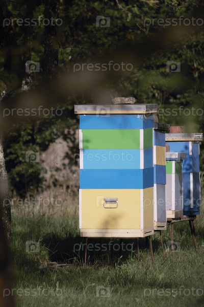 Разноцветные пчелиные ульи. Встаньте рядами в деревенском саду