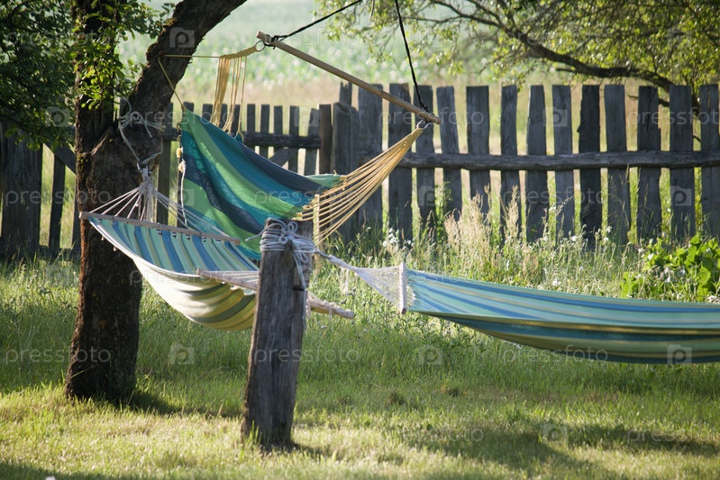 Для отдыха вешают гамаки. Между столбами и деревьями. Старый деревянный забор, сельский отдых