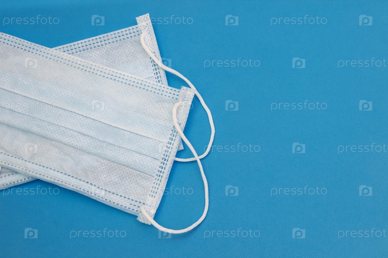 Две медицинские одноразовые маски на синем фоне с пустым пространством для текста, пространство для копирования, плоская планировка, вид сверху