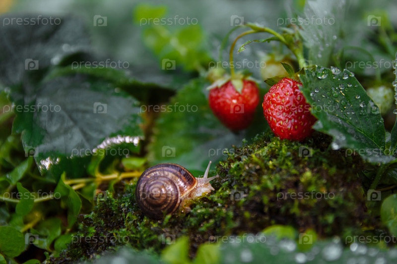 Большая коричневая улитка ползет по траве и зеленому мху к спелой и красной клубнике с каплями воды после дождя, концепция макромира и садовых вредителей