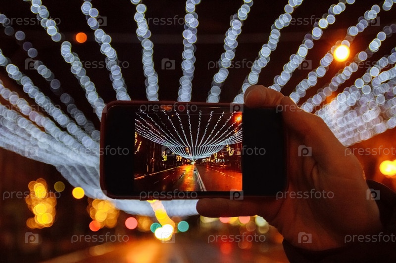 Шум, зерно, не в фокусе, эффект пленки рука с телефоном фотографирует огни, гирлянды и украшения улиц зимой после ночного дождя с отражением и боке, Рождество, Новый год