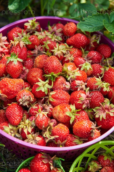 Ягодный сезон. Яркое красочное ведро с ягодами клубники на зеленой траве, вид крупным планом