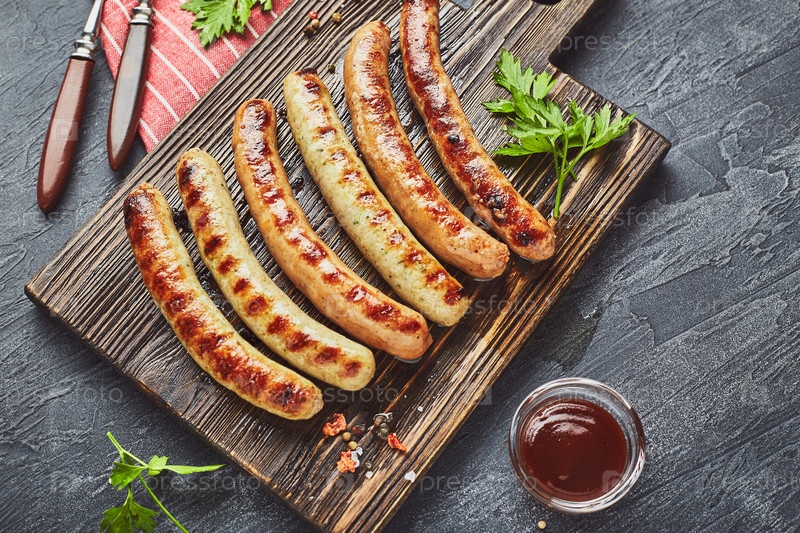 Вкусные свиные колбаски на гриле со специями и травами на деревянной разделочной доске крупным планом