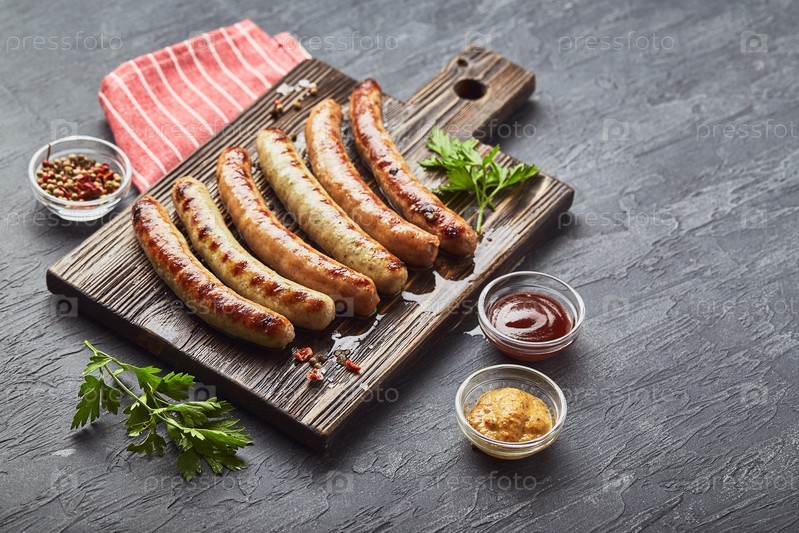 Вкусные свиные колбаски на гриле со специями и травами на деревянной разделочной доске крупным планом