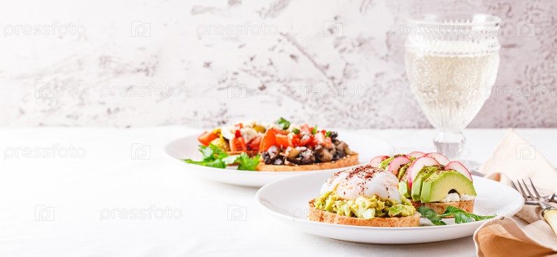 Тост с авокадо и яйцом пашот и тост с авокадо и редисом. Концепция здорового питания. Длинный широкий баннер. Место для текста
