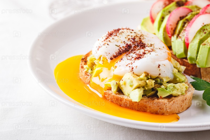 Тост с авокадо и яйцом пашот и тост с авокадо и редисом. Концепция здорового питания