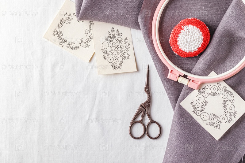Набор для вышивки. Льняная ткань, схемы для вышивания, пяльцы и иглы