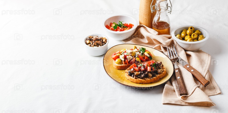 Вкусная брускетта с помидорами и грибами, а также брускетта с голубым сыром, оливками и помидорами. Длинный широкий баннер