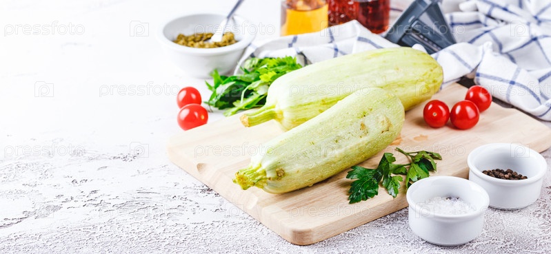 Два свежих кабачка на деревянной разделочной доске на белом фоне
