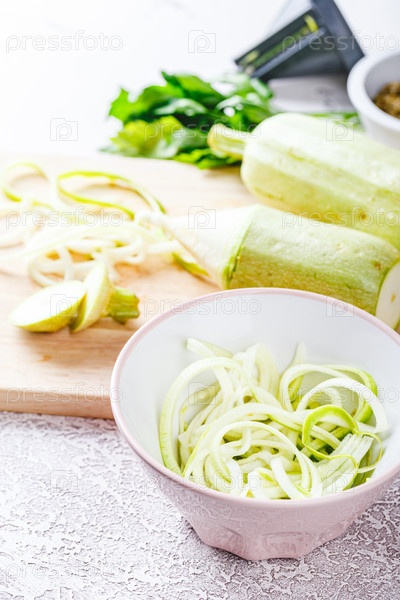 Цуккини веганские макароны и цукини на деревянной разделочной доске. Вегетарианская здоровая пища