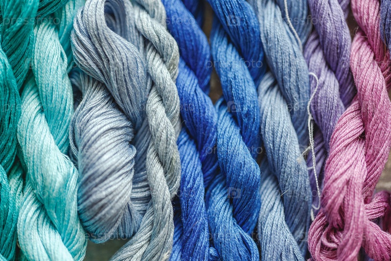Красочный фон из вышивальных нитей бирюзового, синего и сиреневого цветов. Крупный план