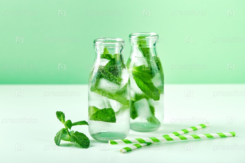 Летний напиток, свежий лимонад с мятой и льдом в стеклянных бутылках. Вода с мятой, коктейль, детокс-напиток или лимонад