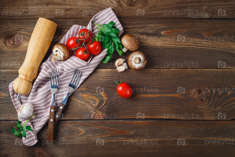 Помидоры, чеснок, шампиньоны, петрушка, перечница, вилки и салфетка на деревянном фоне