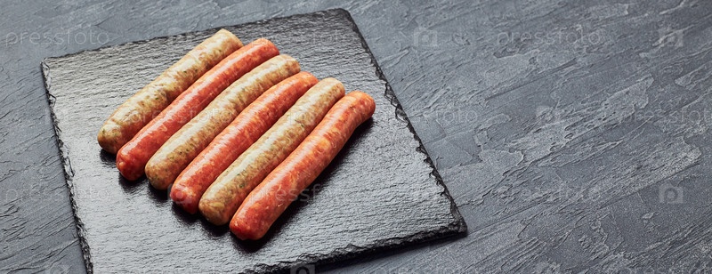 Сырые мясные колбаски на грифельной доске. Вид сверху