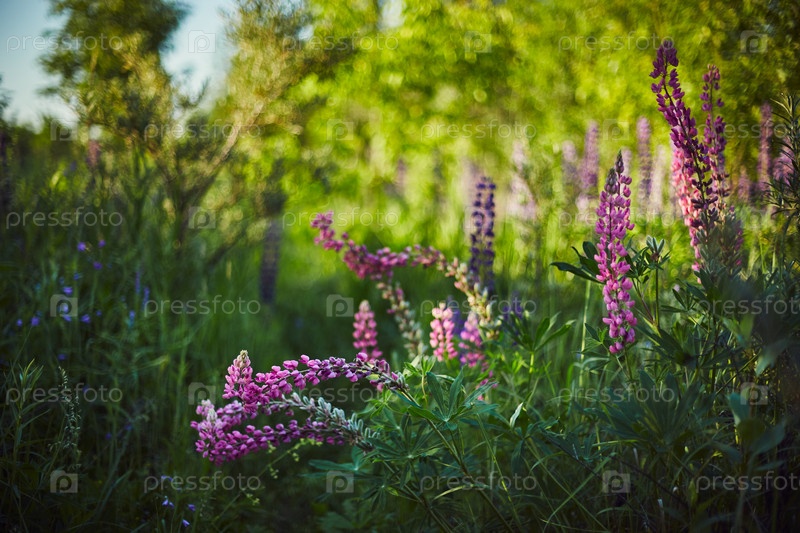 Цветет фиолетовый люпин. Крупный план ярких цветов в зеленой траве