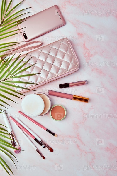 Плоская лежала с набором декоративной косметики, инструментов для макияжа и женских аксессуаров