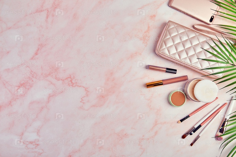 Плоская лежала с набором декоративной косметики, инструментов для макияжа и женских аксессуаров