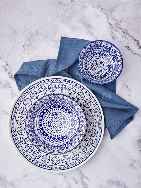 Набор современных модных тарелок на мраморном фоне. Минималистичная квартира лежала с посудой