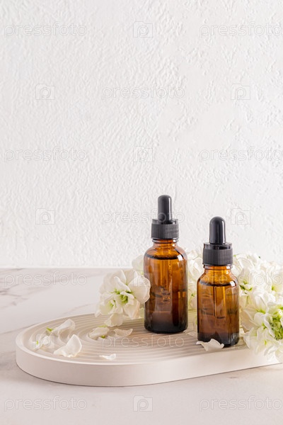 Коричневые янтарные бутылки с антивозрастным средством по уходу за кожей лица на белом гипсовом подносе с белыми цветами. омолаживающий эффект. Вертикальный вид