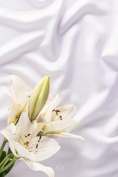 Вертикальный свадебный или праздничный фон с местом для текста из мягкой белой ткани с волнами и свежими цветами белой лилии. открытка. приглашение