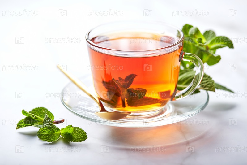 Черный чай в стеклянной прозрачной кружке с листьями мяты. Успокаивающий чай, антистресс