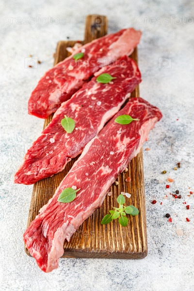 Сырой стейк со специями на деревянной разделочной доске