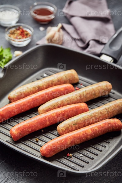 Колбаски из сырого мяса на квадратной сковороде-гриль, с травами и специями. Вид сверху