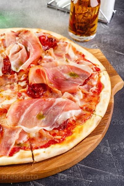 Пицца с салями и прошутто на деревянной доске на темном фоне