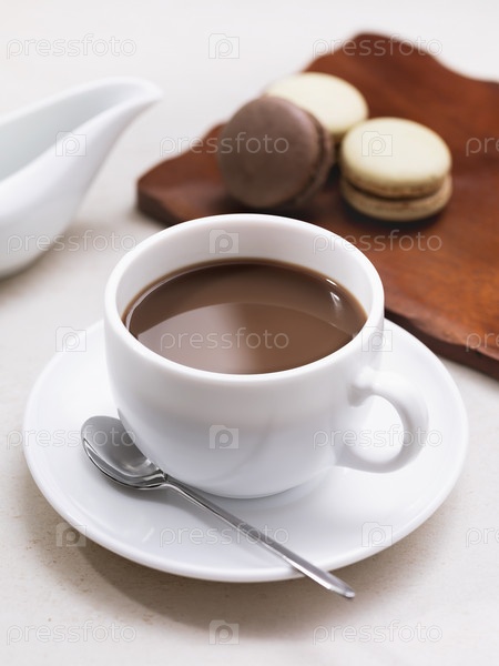 Налил капучино в белую керамическую чашку, завтрак с макаронами