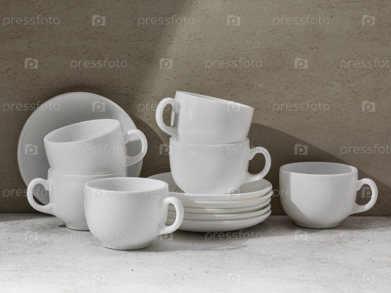 Набор белой керамической посуды на столе, чашки и блюдца для чая или кофе