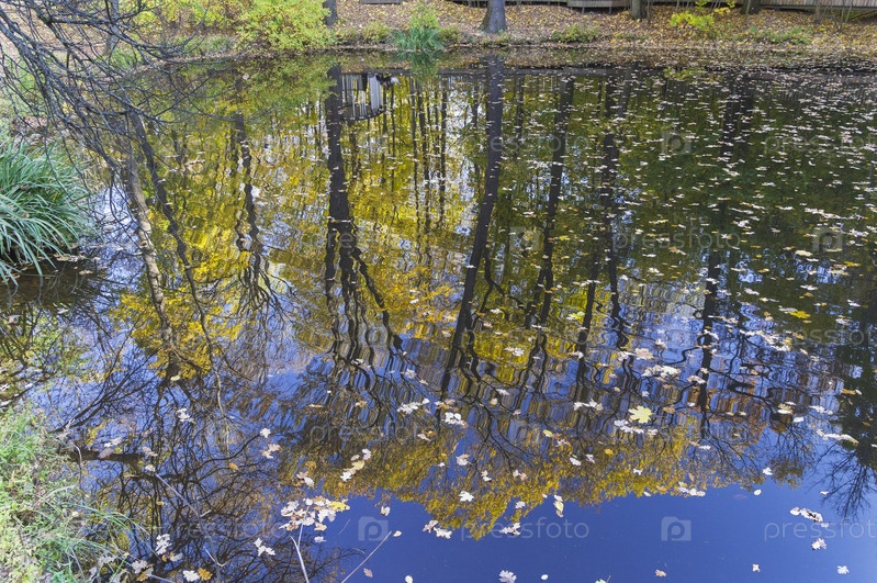 Отражение деревьев в маленьком пруду. Экологическая тропа на Ленинских (Воробьевых) горах, Москва. Середина октября