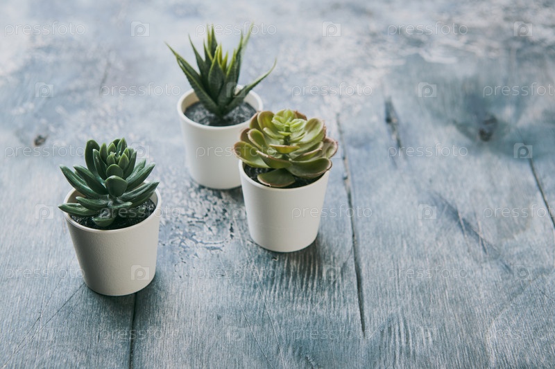 Различные виды эхеверии, сочные комнатные растения хавортия в глиняных горшках на заднем плане. Скандинавское хипстерское украшение дома